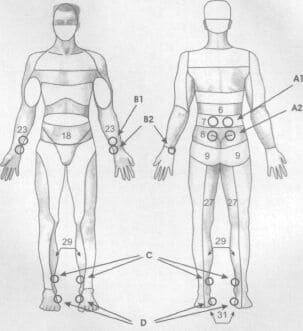 You may apply the small applicators to the insides of the shanks and thighs for all the abovementioned problems (for example, stimulate points A, B, C, D).